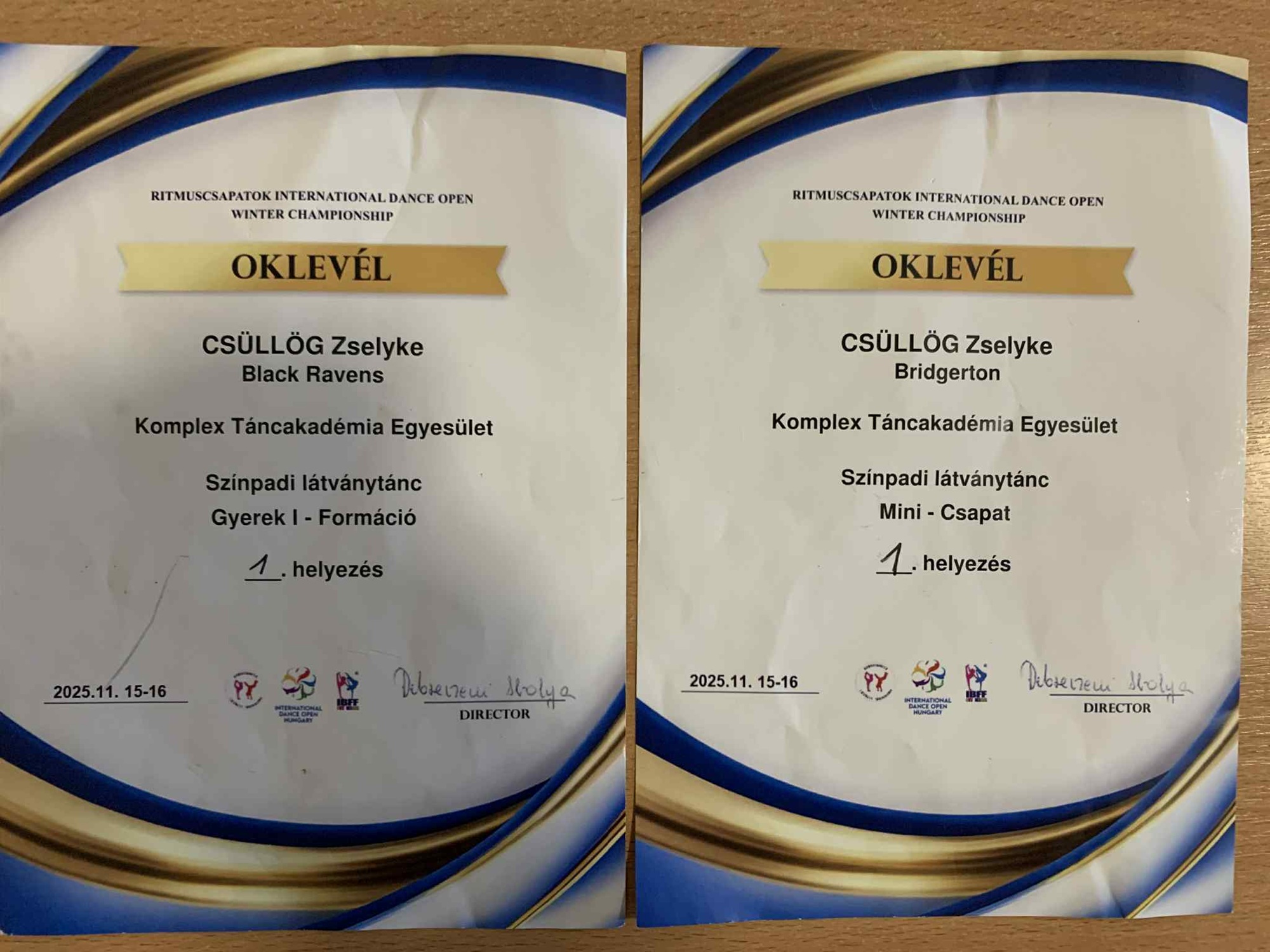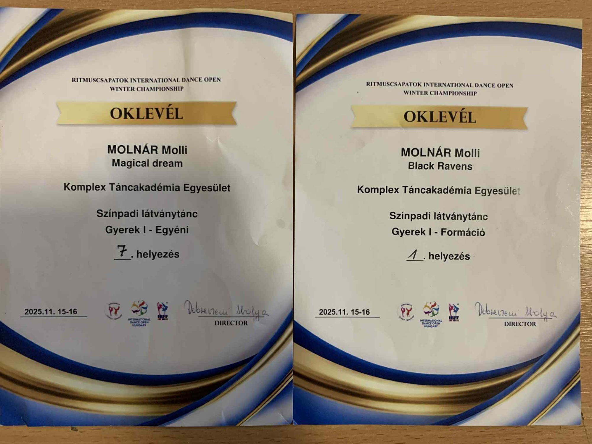 Molnár Molli és Csüllög Zselyke, 3.A osztályos tanulók részt vettek a Komplex Táncakadémiát képviselve, a hétvégén Fóton megrendezésre kerülô Ritmus Csapatok Országos Táncversenyén.