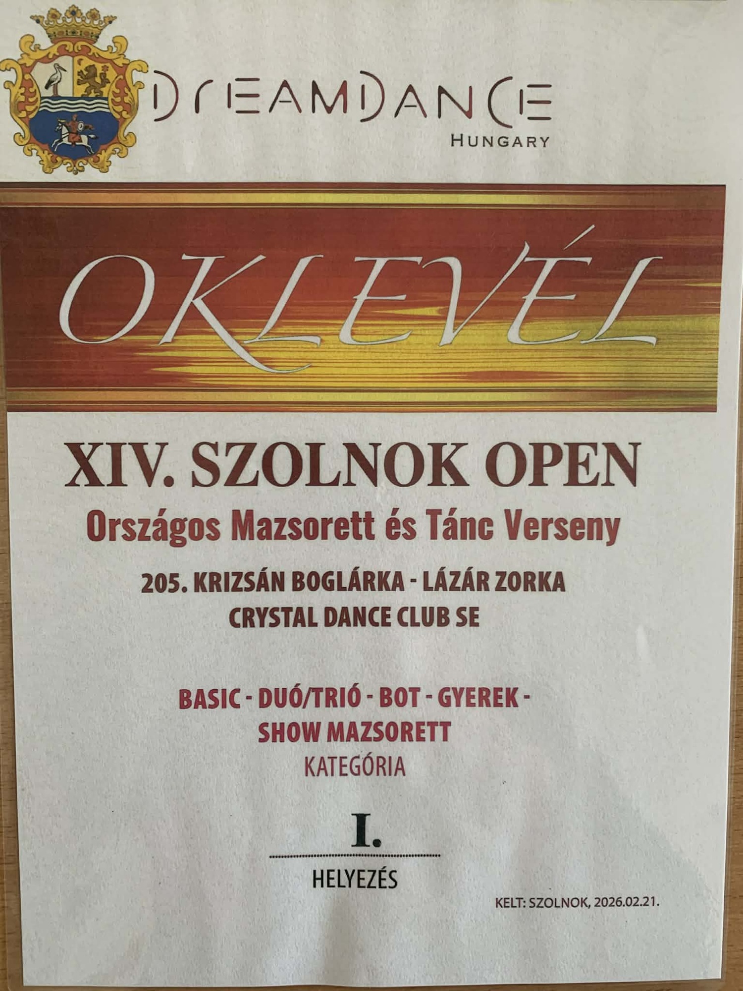 Lázár Zorka 5.b évfolyamos tanuló első helyezést ért el XIV. Szolnokon Open Országos Mazsorett és Táncversenyen.